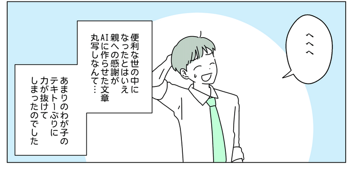 今はどんな文章もAIが生成してくれる、とても便利な世の中になりました。私は全く使いこなせていませんが、息子世代になると「困ったときはAIに頼ればいい」という発想になるのでしょうか……?
