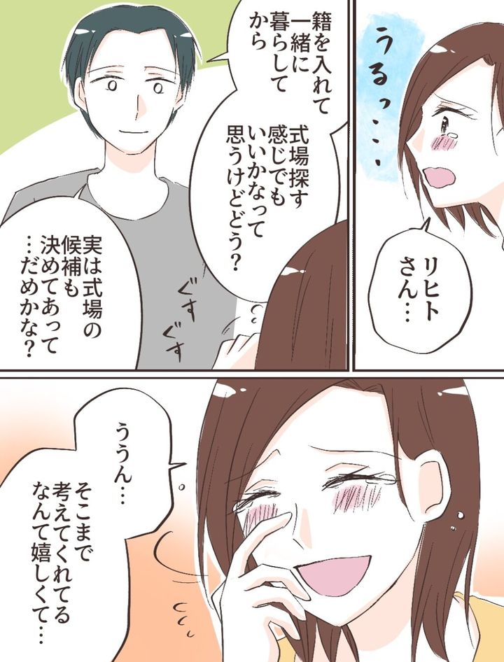 「リヒトさん・・」そう言いながら思わず涙が。「籍を入れて一緒に暮らしてから、式場探す感じでもいいかなって思うけどどう?実は式場の候補も決めてあって・・だめかな?」リヒトさんの言葉に、「ううん・・そこまで考えてくれてるなんて嬉しくて・・」と言うと、