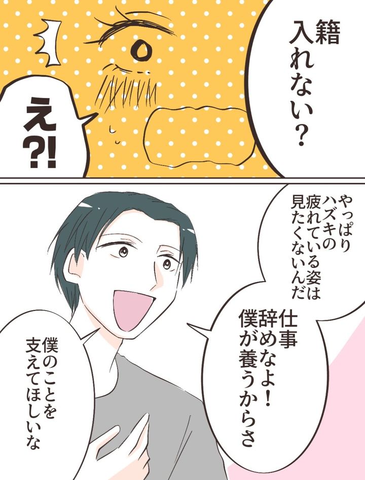 「籍入れない?」と言われて「え!?」とビックリ!!すると、「やっぱりハズキの疲れている姿は見たくないんだ。仕事辞めなよ!僕が養うからさ。僕のことを支えてほしいな」と言うリヒトさん。