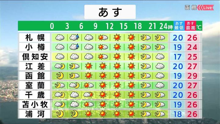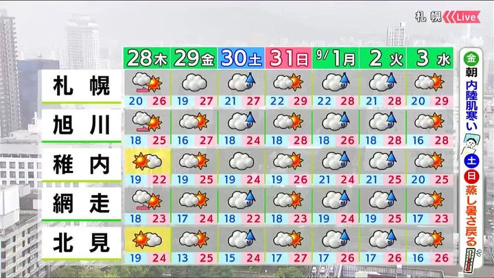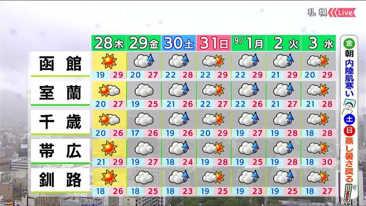 あす28日(水)は貴重な日差しです。金曜は雲に覆われ、夜は道南で雨、土曜日は各地で雨が降るでしょう。気温は高めでムシムシする日が多いですが、真夏日の地点は少なくなります。