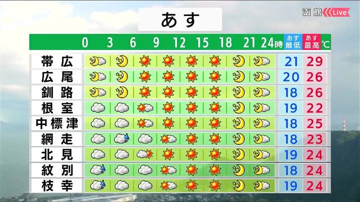 オホーツク海側の海岸部で朝まで弱い雨が降りますが、その他は朝から晴れるでしょう。北風がやや強く、根室やオホーツク海側は気温が25度に届かず涼しくなりそうです。