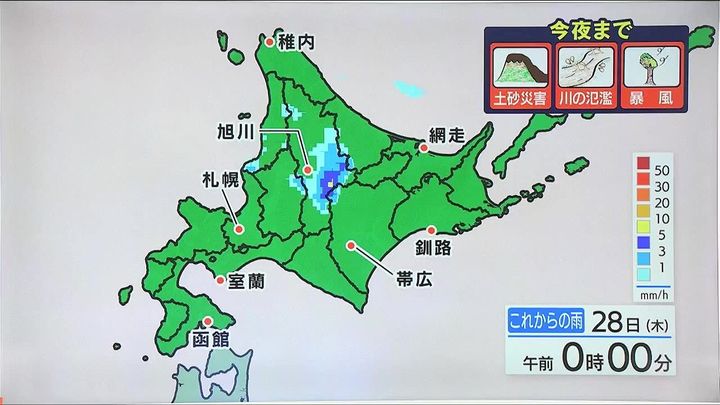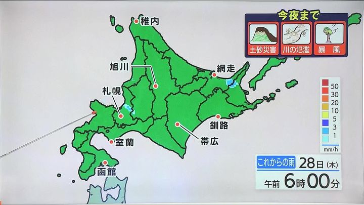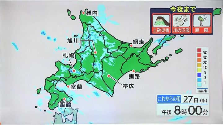 日付が変わると雨はやんでいきますが、知床半島周辺や石狩湾周辺などで弱い雨が残るでしょう。警報は今夜までですが、あす28日(水)も崖や川など危険な場所に近づかないで下さい。