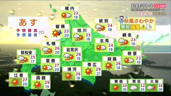 天気は回復し、晴れるでしょう。上空には涼しい空気が流れ込み、秋風が吹いて爽やかな空気ですが、道東方面は強風に注意して下さい。最低気温はけさより4度前後低く、寝苦しさは落ち着きます。最高気温は26度前後でカラッとした暑さです。