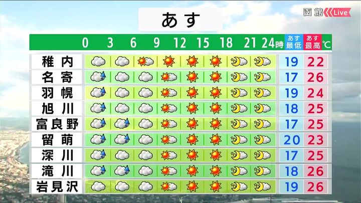 朝まで札幌や小樽周辺で雨の降る時間があるでしょう。日中は各地で澄んだ青空が広がります。朝は涼しくなるため、今夜は布団選びに気を付けて下さい。