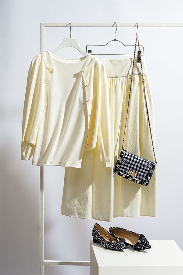 バッグ¥74,800/ルネ 靴¥18,700/WASHINGTON(銀座ワシントン銀座本店) カーディガン¥7,920/31 Sons de mode(ダブルエー) カットソー¥7,700/N.O.R.C スカート¥25,300/アウディーレ
