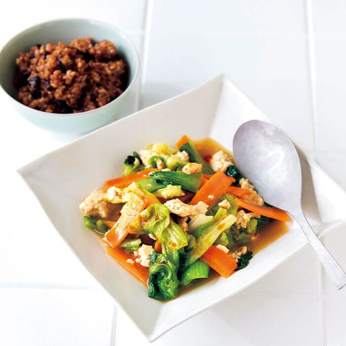 腸活ポイント:カット野菜で手軽に食物繊維を摂取。発酵食品のみそで腸活を促し、肌や髪の健康保守