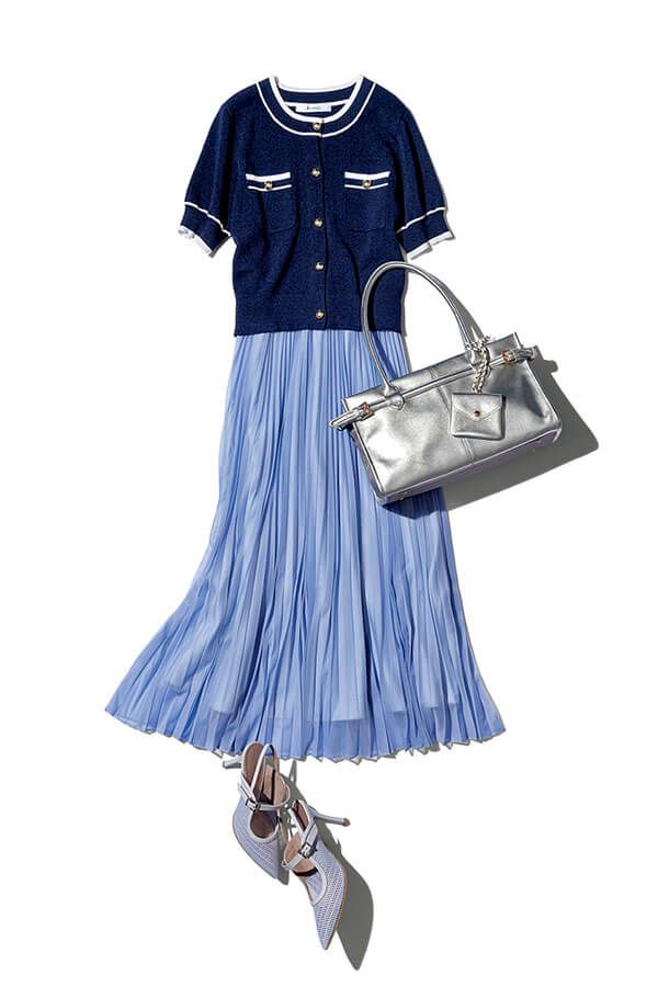 ネイビーカーデに効いた白のラインが品格を表現。流れるようなプリーツスカートで、洗練されたオフィス服へ誘導。