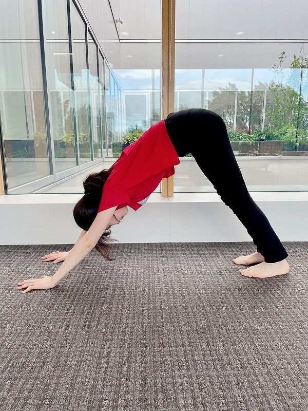 ②鼻から息を吸って、腰を高く持ち上げる。