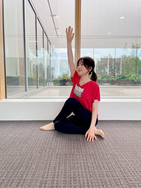 ④鼻から息を吸って、左手を上にあげる。