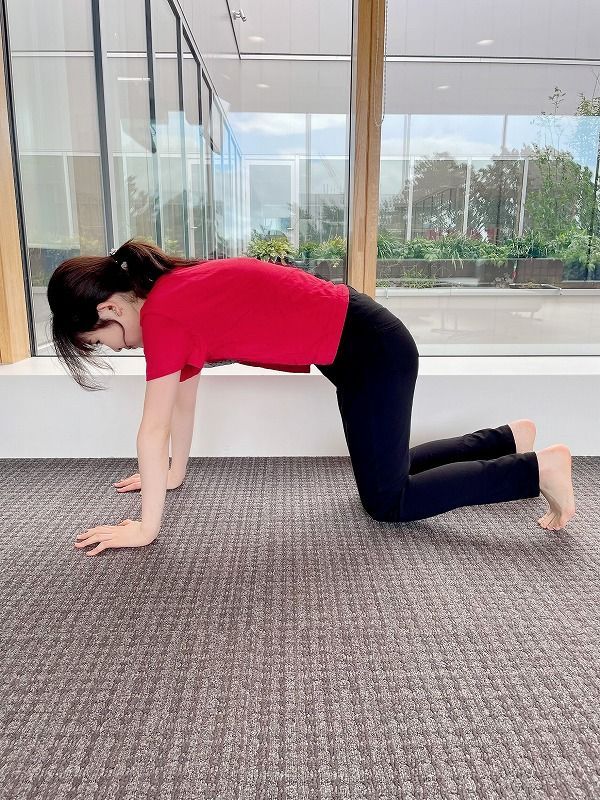 ①四つん這いの状態になり、足は腰幅くらいに広げ、足の指を立てる。
