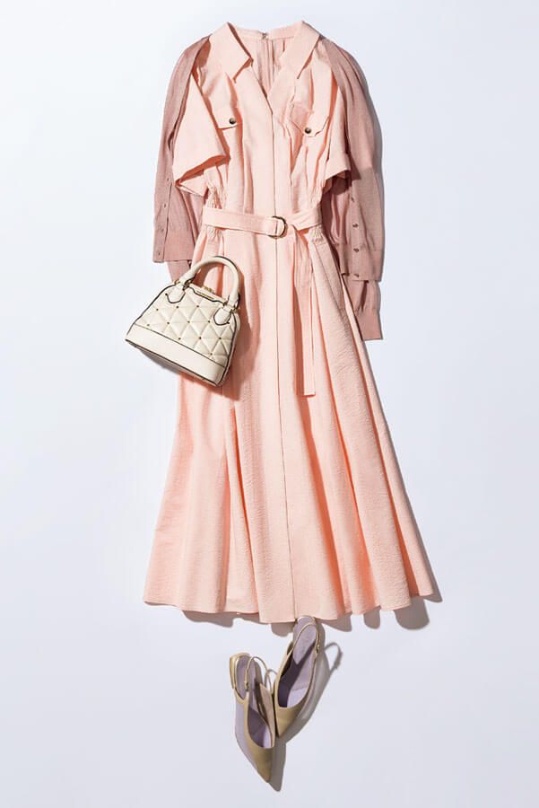 ピンクのレイヤードでシャツワンピを甘く華やかに