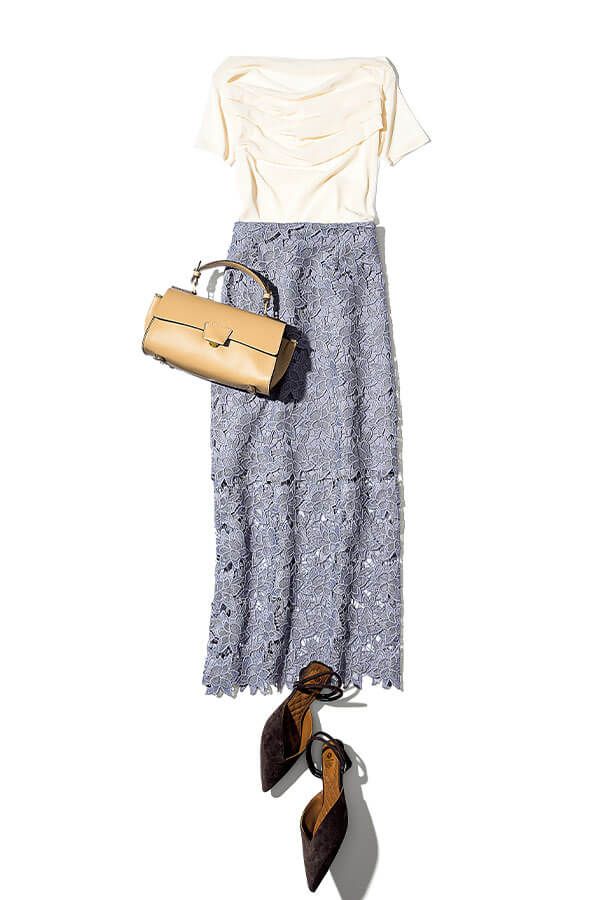 オフィス要員のレースタイトに、ドレープトップスを掛け合わせれば、たちまち今っぽいムードが上昇!