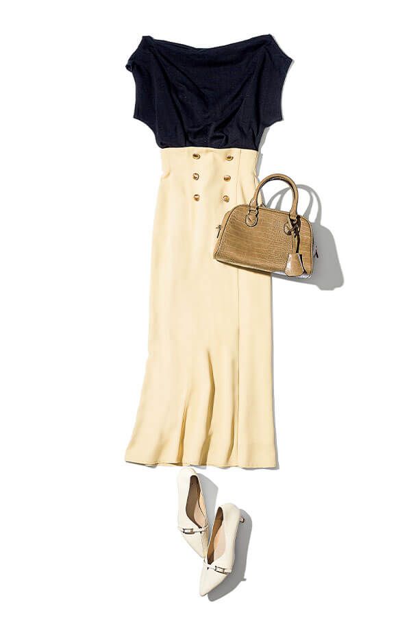 カットソー¥2,498/Re:EDIT スカート¥4,290/INGNI バッグ¥46,200/LORISTELLA(フランドルカスタマーサービス) パンプス¥42,900/ダブルスタンダードクロージング(フィルム)