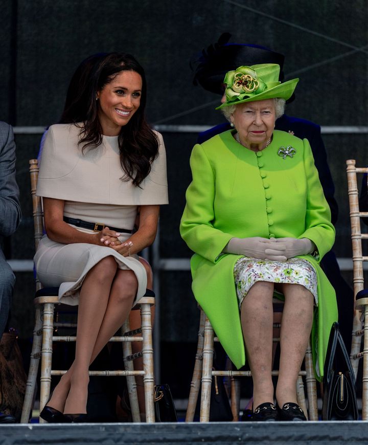 Queen Elizabeth II and Meghan, Duchess of Sussex during a visit to the Catalyst Museum by the Mersey Gateway Bridge on June 14, 2018 in Widnes, England.