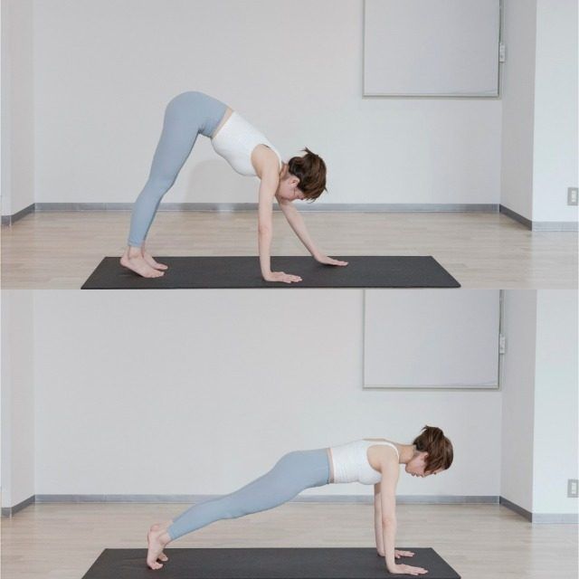 (4)手が肩の真下に来たところで両ひざをついてプランクの体勢になり、腕立て伏せを1回する