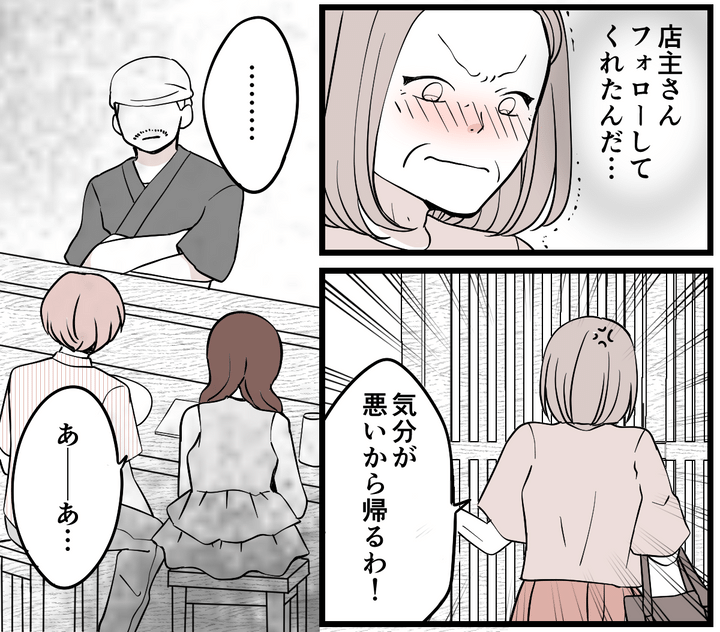 庇ってほしかったハヤトは素知らぬ顔でビールを飲んでいて、泣きそうになっていると店主さんが庇ってくれたのです。