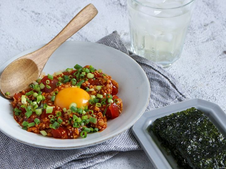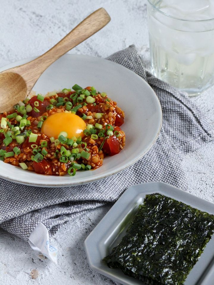 韓国のりはまぐろをのせて巻いて食べても、ちぎってトッピングしても◎。お好きな方でやっちゃってください!