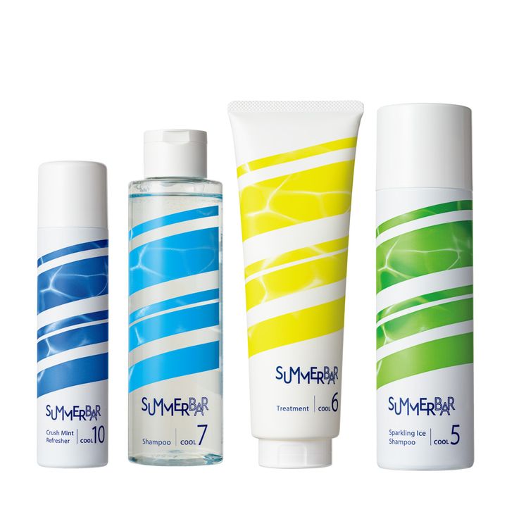 左から/クラッシュミントリフレッシャー クール10 150g 2,750円、シャンプー クール7 250㎖ 1,760円、トリートメント クール6 240g 2,750円、スパークリング アイスシャンプー クール5 180g 2,750円(デミ コスメティクス TEL:0120-68-7968)