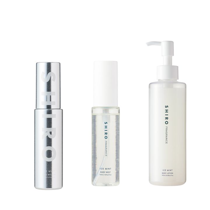 左から/アイスミント ボディミスト エクストラクール 50㎖ 2,090円、同ボディミスト 50㎖ 1,980円、同ボディローション 190㎖ 2,530円、(シロ カスタマーサポート info@shiro-shiro.jp)