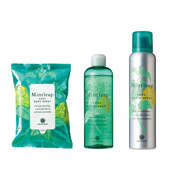 左から/ミントリープ クール ボディシート 20枚 660円、同ボディソープ 300㎖ 1,430円、同スカルプスプレー 100g 1,650円、(ハウス オブ ローゼ TEL:0120-12-6860)