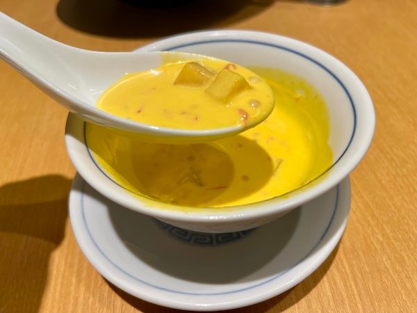 熟成黒酢のビンテージ感漂う独特な風味と薬膳スパイス辣油の痺れ&辛味で疲れなんて一気に吹き飛んじゃいました。濃厚なナッツやシャキシャキのミョウガなど食感もリズミカル。この日はかなり遅い時間だったからなのか?メニュー写真とは少し異なる野菜に。大好きなクリーミーな甘さのトウモロコシ(野菜等はその日の状況で変わる場合もあるとのこと)も添えられて感謝しかありません!(メイン、点心、デザートのセットで各1800円)