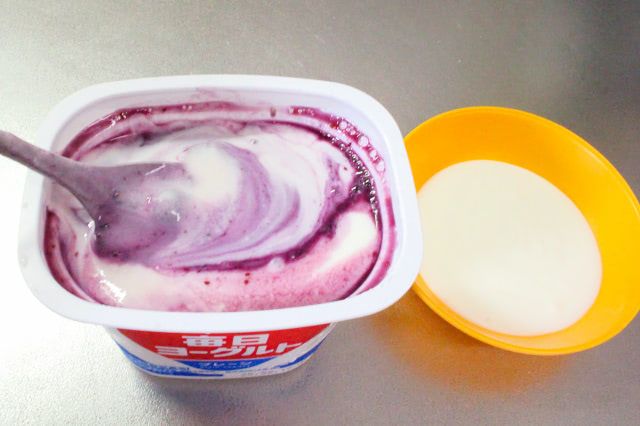 ヨーグルトを底からかき混ぜてダマを無くします。かき混ぜたヨーグルトにブルーベリーソースを加えると容器から溢れそうだっため、ヨーグルトをカレースプーンで5杯取り除きました。