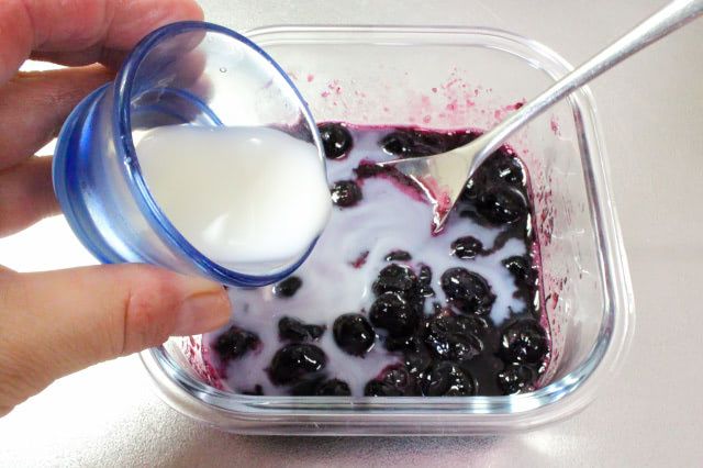 1. 耐熱容器に冷凍ブルーベリーと砂糖を入れて混ぜ、電子レンジ(600W)で1分30秒加熱して潰し、牛乳を加えます。