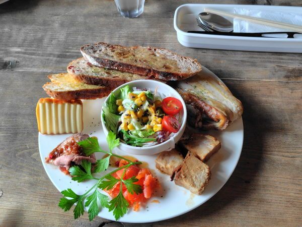 すべて自家製で、ローストビーフや焼き豚に大きなベーコンと肉好きにはたまらないプレートになっています。さらにスモークサーモンやサラダ自家製パンもあり、かなり満足度の高いプレートになっています。カットチーズやクリームチーズも盛られていて、チーズ好きも笑顔になるプレートです。