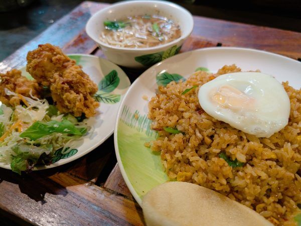 この日の満腹ランチは1番のナシゴレンスペシャルでした。ナシゴレンスペシャルは、バリ風焼きめし(ナシゴレン)と鶏のからあげと汁麺のセットで、ナシゴレンには目玉焼きが乗っていてボリュームたっぷり!