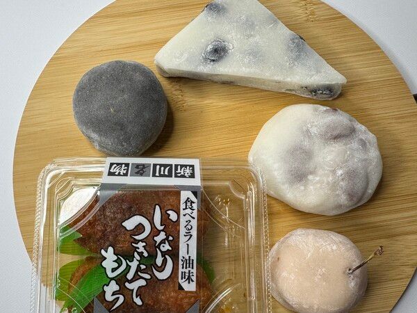 赤飯大福、黒大福、さくらんぼ大福、食べるラー油味いなりつきたてもち