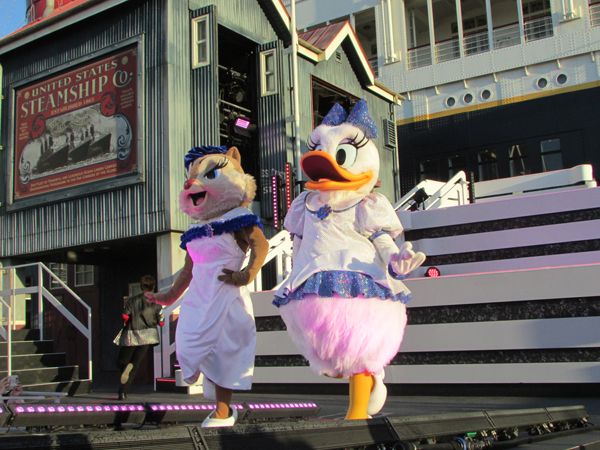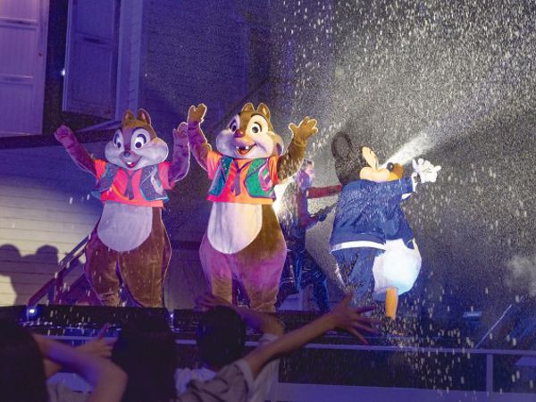 ドナルドダック、チップとデールは大量の水が放たれる中、ダンサーとともにクールなステップを披露。