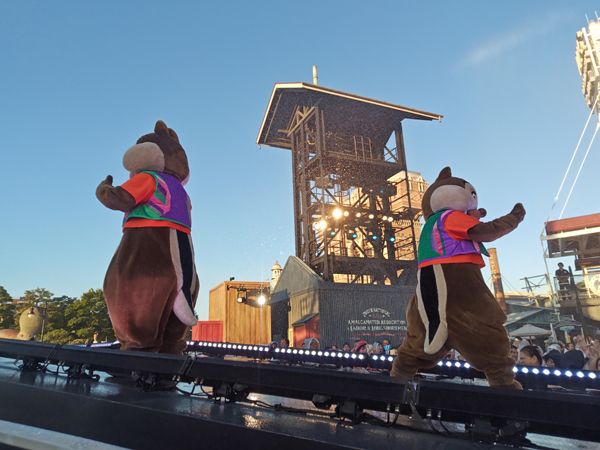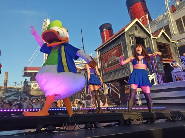 「ドックサイド・スプラッシュ・リミックス」は17:55、19:25、20:55の1日3回公演。スタートが遅い時間なので、15時からの「アーリーイブニングパスポート」と、17時からの「ウィークナイトパスポート」のいずれかで入園しても見ることができます。ちなみに19時台以降だと、パークも暗くなり、全く違った印象に。