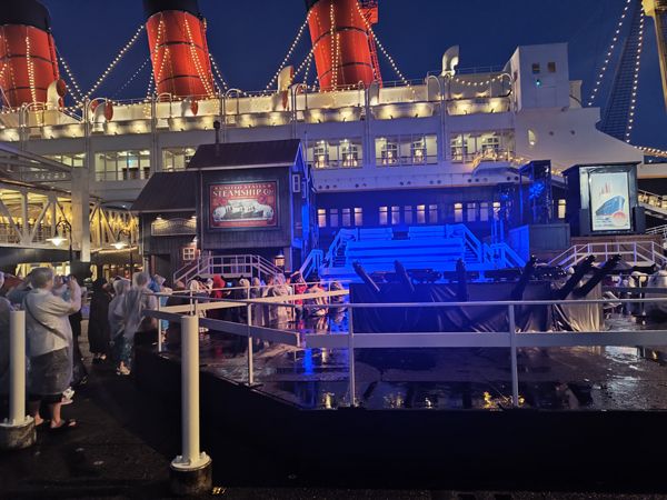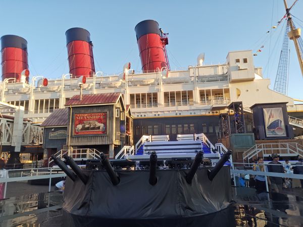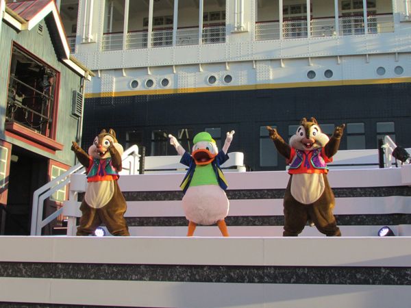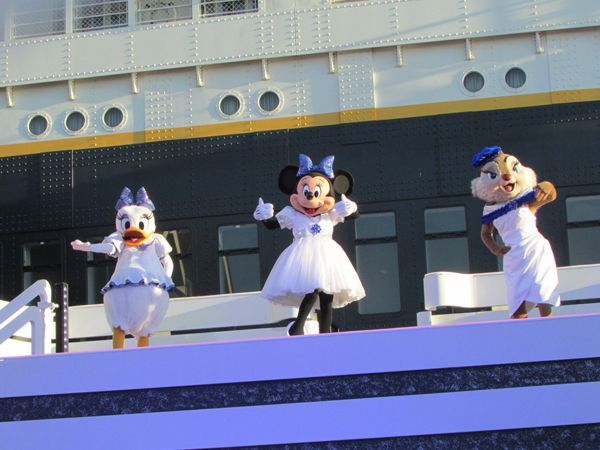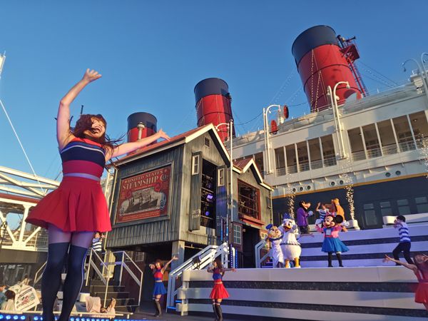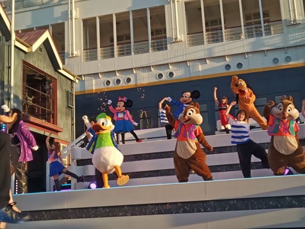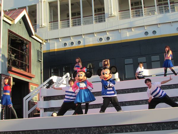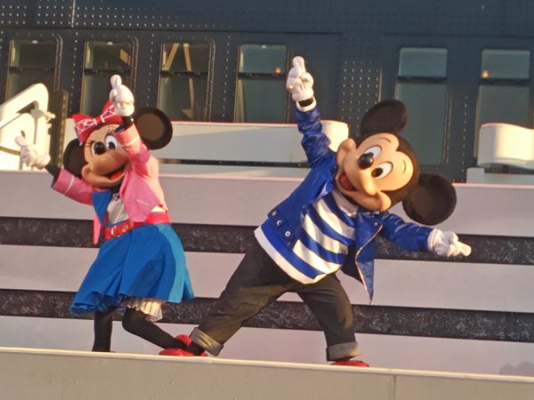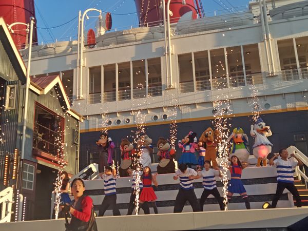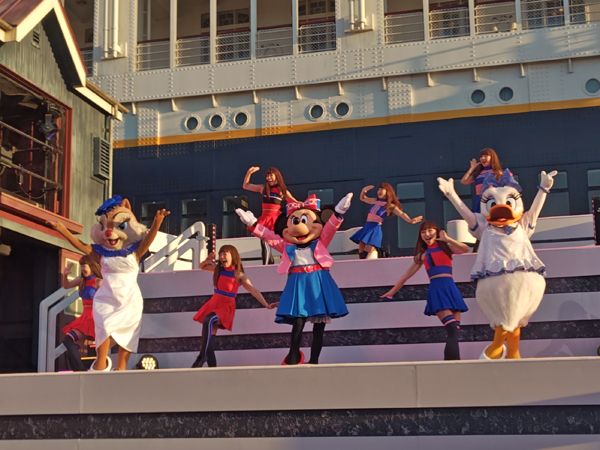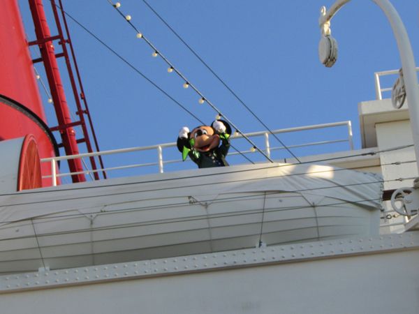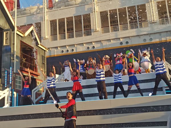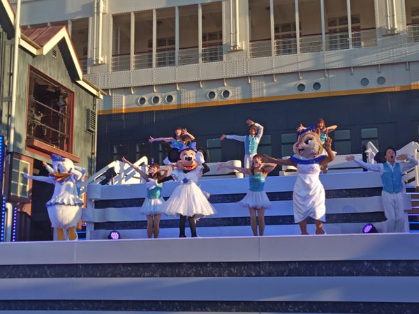 次々とディズニーの仲間たちがステージに登場する中、われらがミッキーマウスはなんとS.S.コロンビア号の上段デッキから登場!