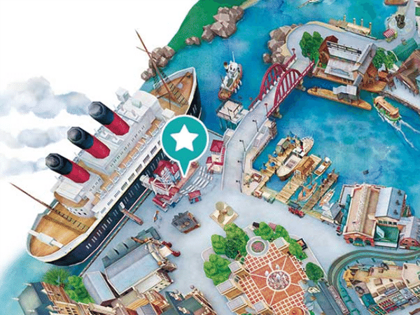 「ドックサイド・スプラッシュ・リミックス」の会場となるのは、S.S.コロンビア号の前にある、ドックサイドステージ(★印のところ)。