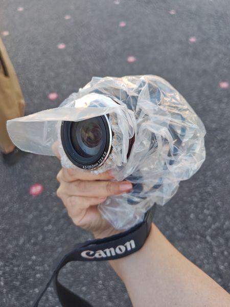 基本はどの鑑賞エリアでも濡れますが、私が参戦したエリアはブルーのエリアで、かなり大量の水がかかると言われている場所。なので防水対策は絶必です。カバンは大きなビニール袋に入れて、水が入らないように封をして、全身ポンチョ&レインハットを装着。さらに水没が怖いので、スマホも水遊び用の防水ケースに入れて、デジカメはビニール袋で作った防水カバーを装着して臨みました。