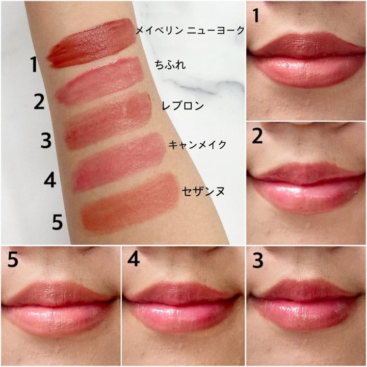 5つのリップを比べるとこのような感じでした。高発色で落ちにくいリップなら「メイベリン ニューヨーク」、グロスとしても使える2Way仕様なら「ちふれ」、とろけるような使い心地とツヤ感バランスなら「レブロン」と「キャンメイク」、ツヤ感をおさえたナチュラル仕上がりを求めるなら「セザンヌ」がオススメ。もちろん、その日のコーディネートや気分によって変えるのも◎。どれも2,000円以下で買えるコスパも最高の優秀リップなので、自分好みのカラーを見つけてみて。