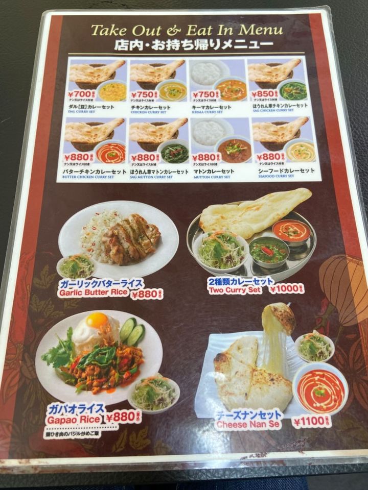 気になるメニューですが、カレーセット・チーズナンセット・ガパオライス・ガーリックバターライス・チキン等のスナック・お酒等をいただくことができます。お持ち帰りOKです。店主さんにおすすめは、チーズナンセットとガーリックバターライスだそうですよ。