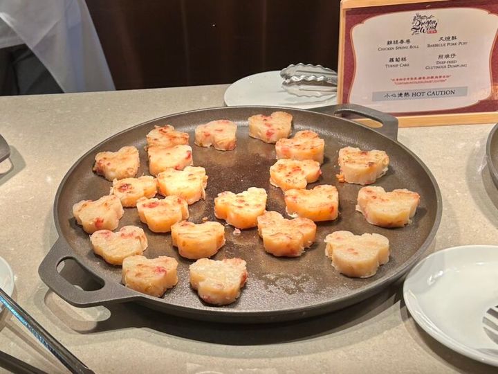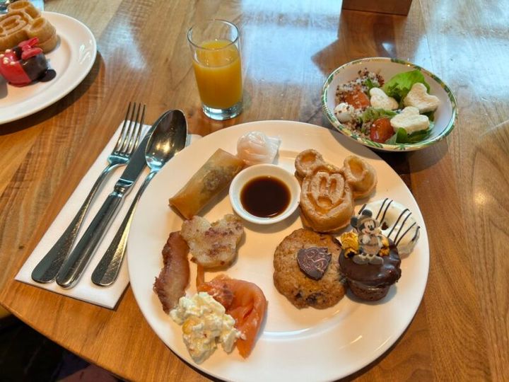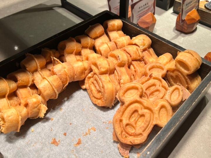 朝食はビュッフェスタイルです。香港を訪れたら絶対に外せない飲茶をはじめ、シェフが目の前で作ってくれるオリジナルの麺料理など、種類豊富なメニューが楽しかったです。さらに、ミッキーマウスのワッフルやチップとデールのクッキーなど、可愛らしいフードやスイーツもたくさんありました。食べるのがもったいない…と思いつつも、全部美味しくいただきました!
