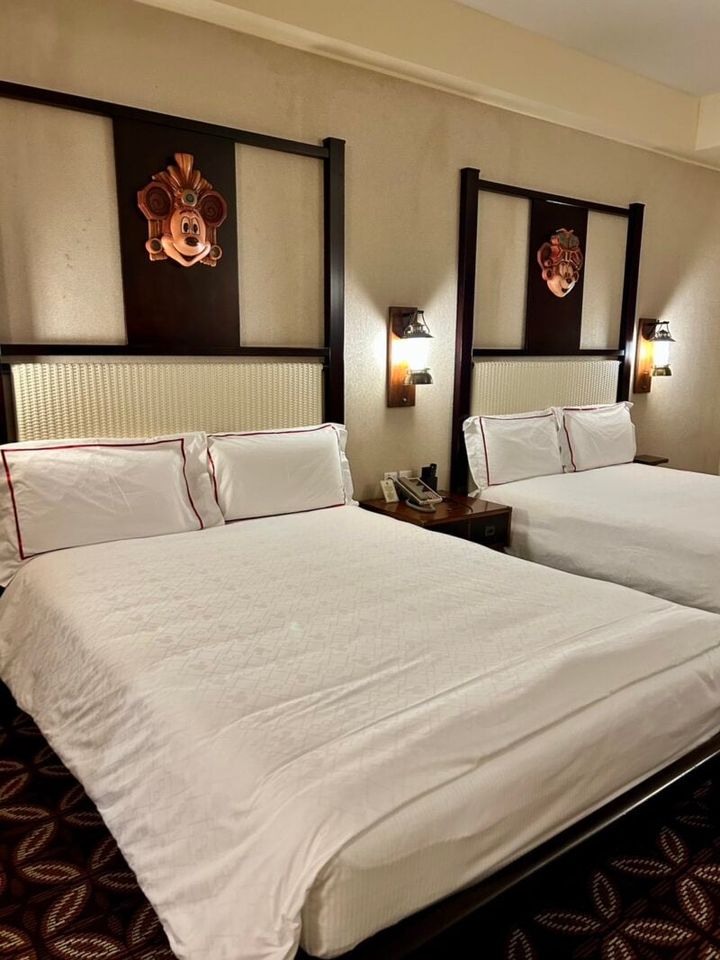 お部屋は35㎡と広々としており、ゆったりとくつろぐことができました。クイーンサイズのベッドが2つあり、ふかふかで、パークでたっぷり遊んだ体の疲れを癒やすことができました。
