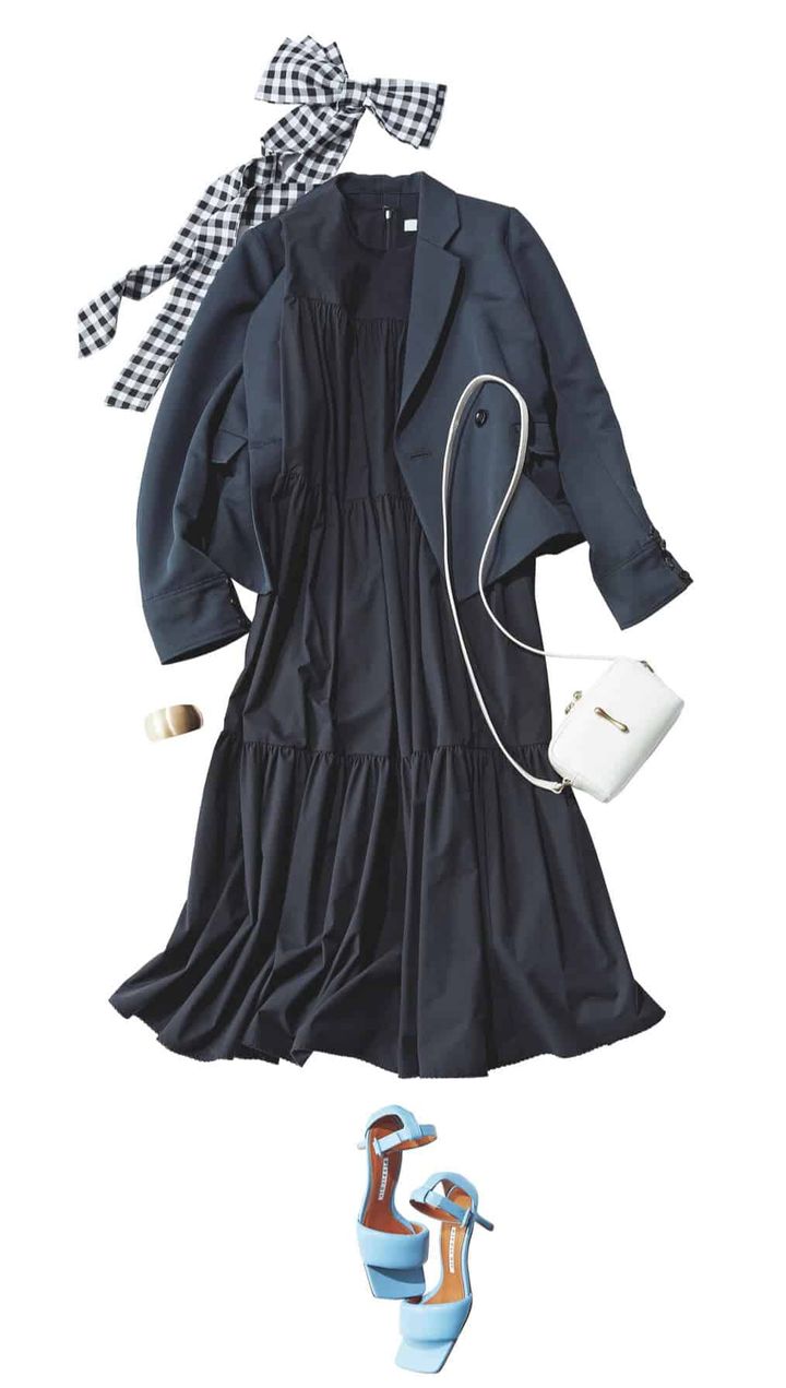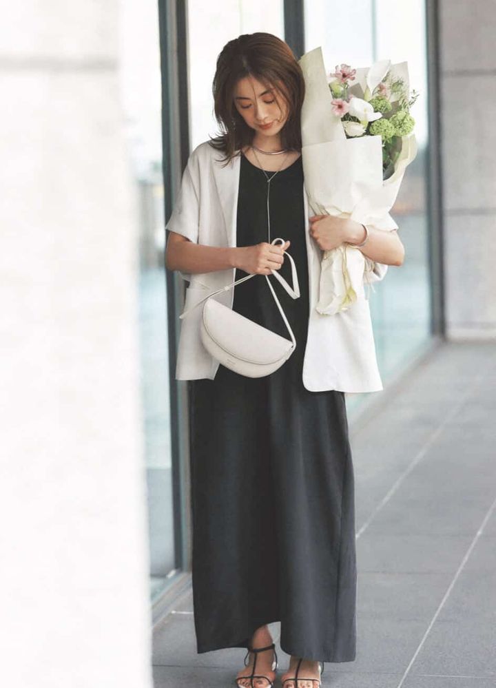 ワンピース¥39,600(サロン アダム エ ロペ)ジャケット¥24,970(FRAY I.D/FRAY I.D ルミネ新宿2店)バッグ¥33,000(ラシット/ラシット 西銀座店)サンダル¥59,{hlb}400(ブレンテッラ/ハウス オブ ロータス)ブレスレット¥33,000チョーカー¥86,900〈ともにニナ・エ・ジュール〉チェーンネックレス¥33,000〈マッソーズアンドマッソーズ〉(すべてショールーム ロイト)