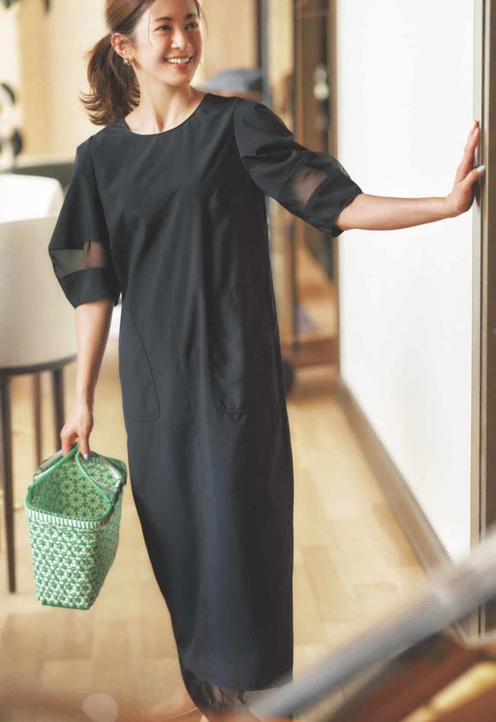 シアーの切り替えがポイントのワンピ。重くなりがちな黒ワンピも程良い透け感で柔らかく。長めの袖丈とシアー素材に視線を集めて、二の腕をしっかりカバーしてくれます。シャープなシルエットで細見え効果もup!カラーのある小物で彩りを取り入れて、親しみやすさをプラス。