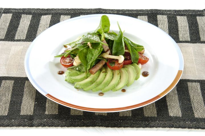 ① サラダほうれん草は4~5cm長さに切って水で洗い、アボカドは種を取り、皮をむいて7~8mm幅に切り、ミニトマトは横半分に切り、ベーコンは1cm角の拍子木切り、白ぶなしめじはほぐす。