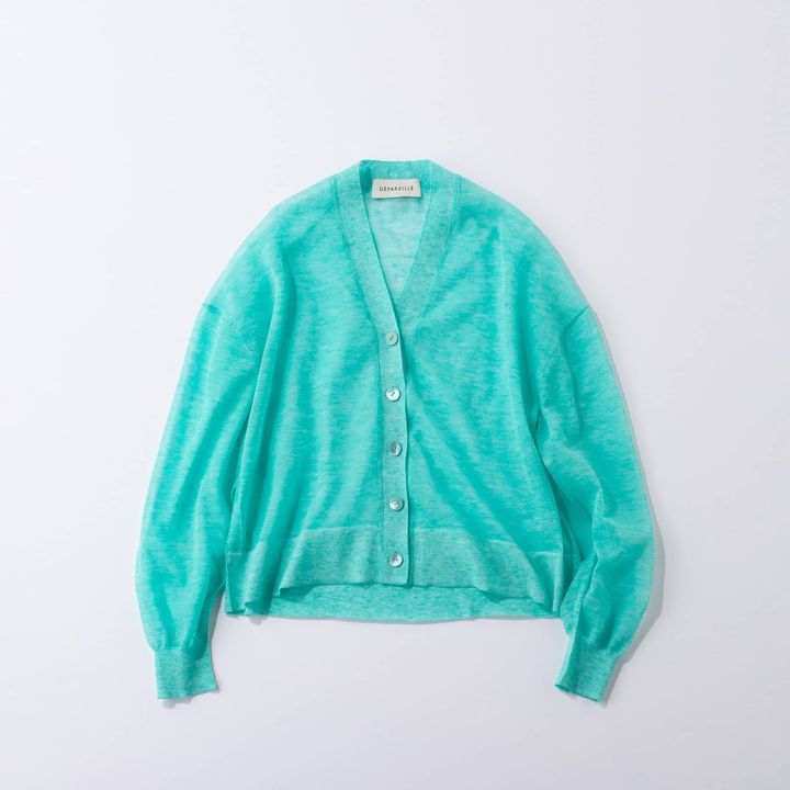 鮮やかなターコイズブルーが目を惹くキレイ色カーディガンは、これ一枚で主役級の存在感。やや張り感があり、袖は丸みをつけたボリュームあるシルエットで、身体のラインを綺麗にみせてくれそうです。透け感のある素材と涼しげカラー。綺麗めなホワイトコーデや、カジュアルなデニムコーデに合わせてみたいです。