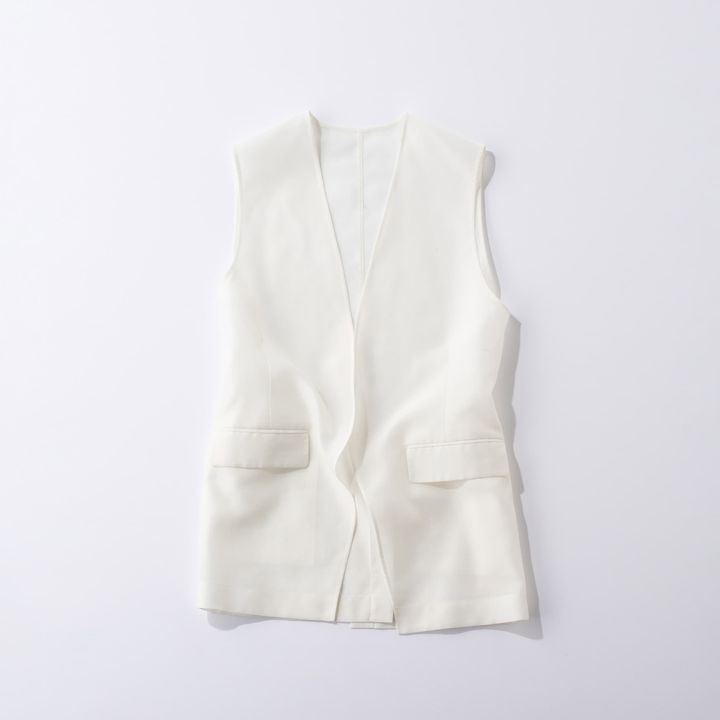 程よい光沢とシアー感のあるオーガンジー素材のジレはシーンを選びません。夏はトップスをボトムスにINすることが増えますが、ジレを羽織ることで腰回りがカバーできるので目くらまし効果が。白いTシャツの上に羽織るだけで簡単にこなれ感が出るし、黒紺のトップスに羽織っても、清涼感がUPしてコントラストが生まれます。ワンピースに重ねても◎