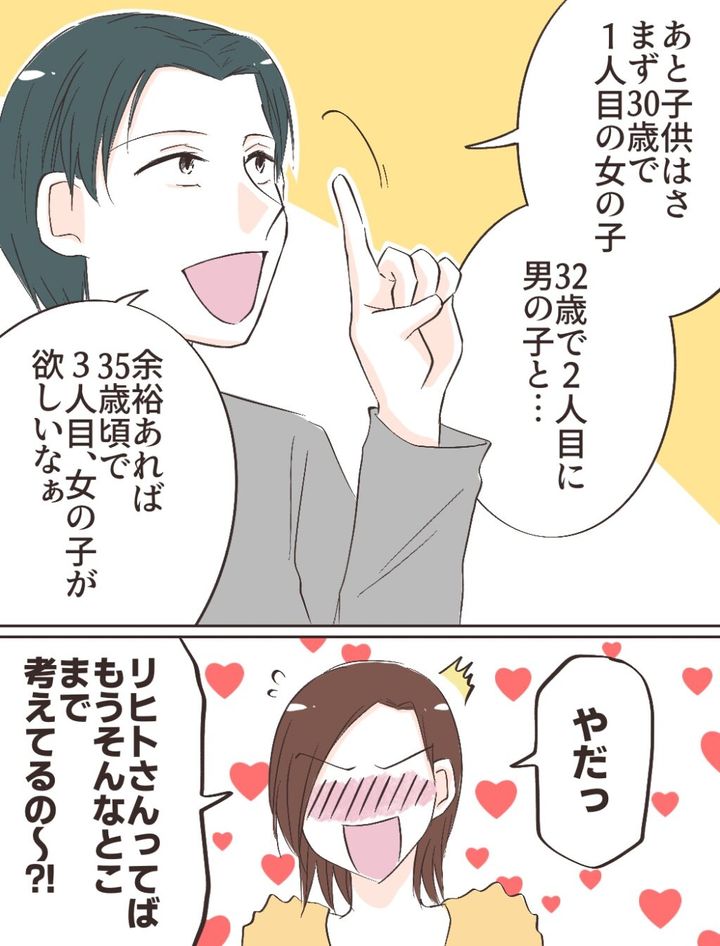「あと子どもはさ、まず30歳で一人目の女の子、32歳で二人目に男の子と・・余裕あれば、35歳頃で三人目、女の子が欲しいなぁ」と具体的に言われ、「やだっ、リヒトさんってば、もうそんなことまで考えてるの~!?」と照れながら答えると、