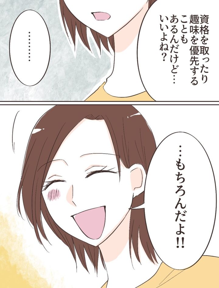 「資格を取ったり、趣味を優先することもあるんだけど・・いいよね?」と言われ、「・・もちろんだよ!!」と笑顔で答えると、