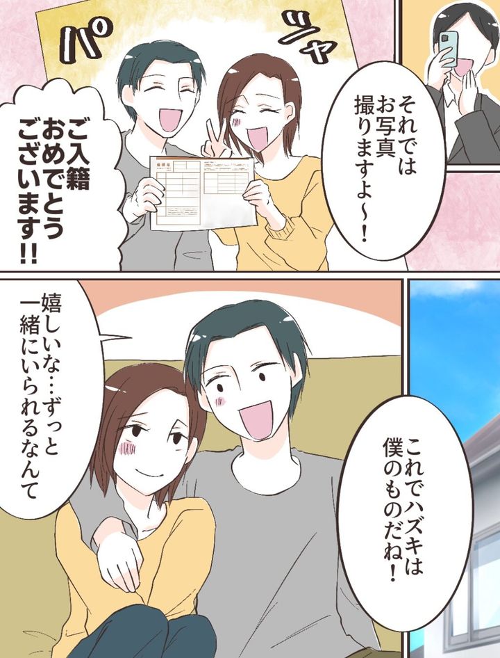 仕事が忙しく疲れ切っていた私を心配するリヒトさんに、突然「籍入れない?」と言われ驚きました。「やっぱり仕事で疲れている姿は見たくない。僕のことを支えてほしい」と言われて感動。式場の候補から、両親への報告のタイミングまで、緻密に決めているリヒトさんに驚きつつ、「早くハズキと一緒にいたくて・・」と言われ、同じ気持ちだと思い、「二人で幸せになろうね!」と手を握りしめました。