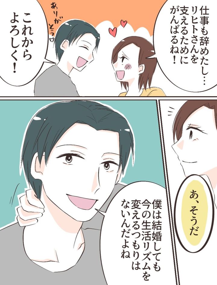 「仕事も辞めたし・・リヒトさんを支えるためにがんばるね!」と言うと、「ありがとう。これからよろしく!」とリヒトさん。すると、「あ、そうだ。僕は結婚しても今の生活リズムを変えるつもりはないんだよね」