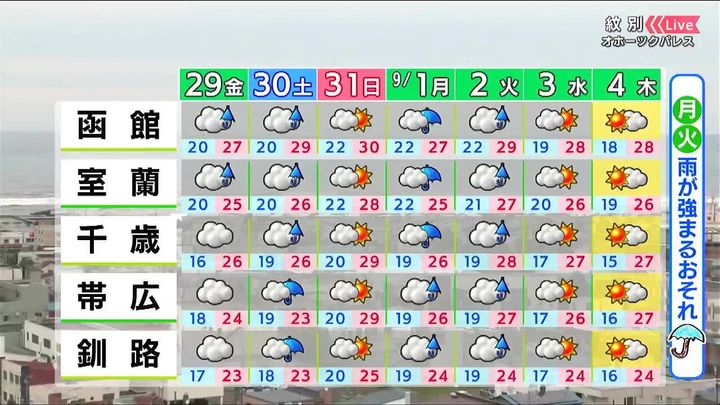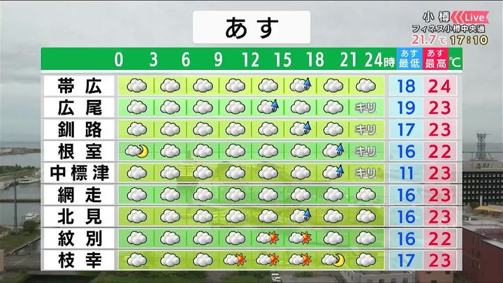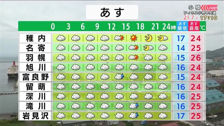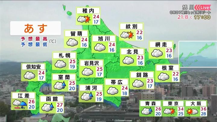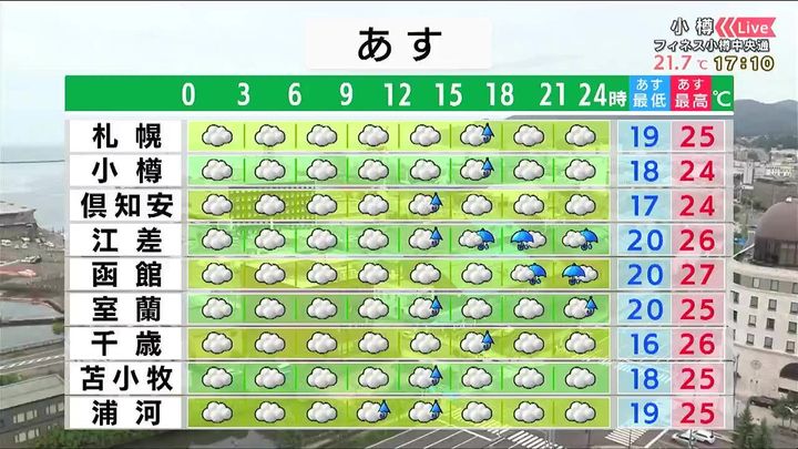 雲に覆われ、道南方面を中心に雨の降る時間があるでしょう。最低気温は20度以下で、札幌19度など今朝とほぼ同じです。最高気温は25度前後で、あすも暑さは控えめです。