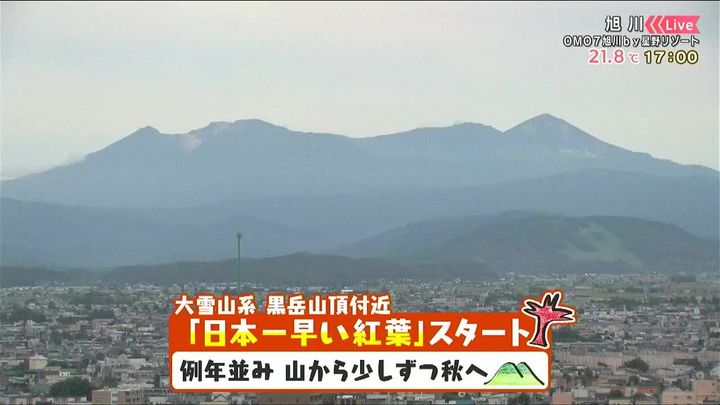 ここで一つ季節の話題です。ロープウェイを運営する「りんゆう観光」によりますと、大雪山系の黒岳山頂付近で、日本一早い紅葉がスタートしました。ウラシマツツジが赤く色づいているそうです。例年並みで、山から少しずつ季節が進む時期になってきました。